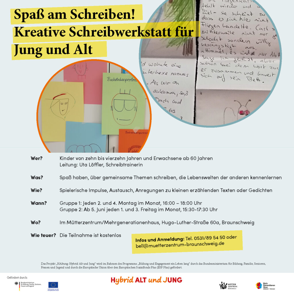 Die Schreibwerkstatt ist Teil des Projektes „Hybrid Alt und Jung“; die Teilnahme ist kostenlos.