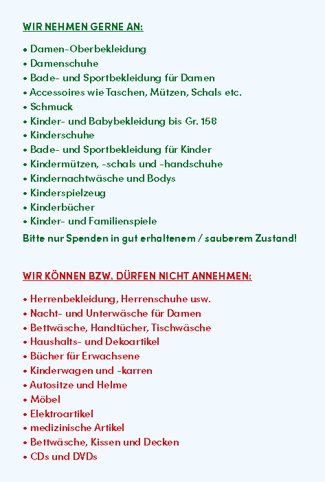 Wir bitten um Ihr Verständnis, dass wir von September bis Februar aus Platzgründen nur Winterware annehmen können und von März bis August nur Sommerware.